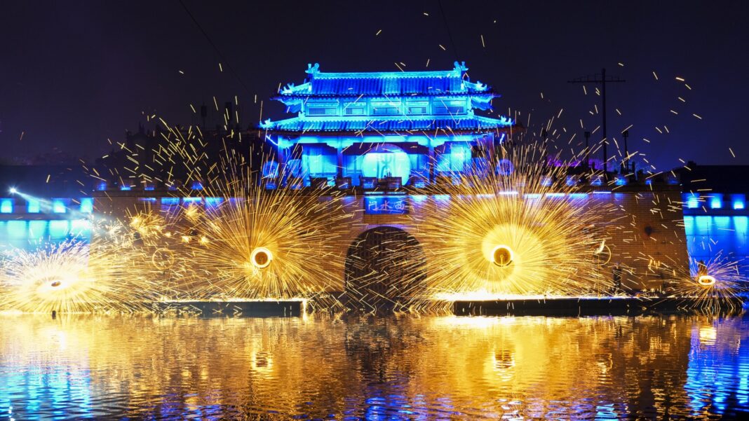 2024年10月23日晚,在古都开封清明上河园内,非遗技艺火壶、打铁花同台表演,呈现出“双倍震撼”的“火树银花”场面,寓意驱疾避祸和百家安宁,亦展现出中国非遗技艺的独特魅力和文化底蕴。