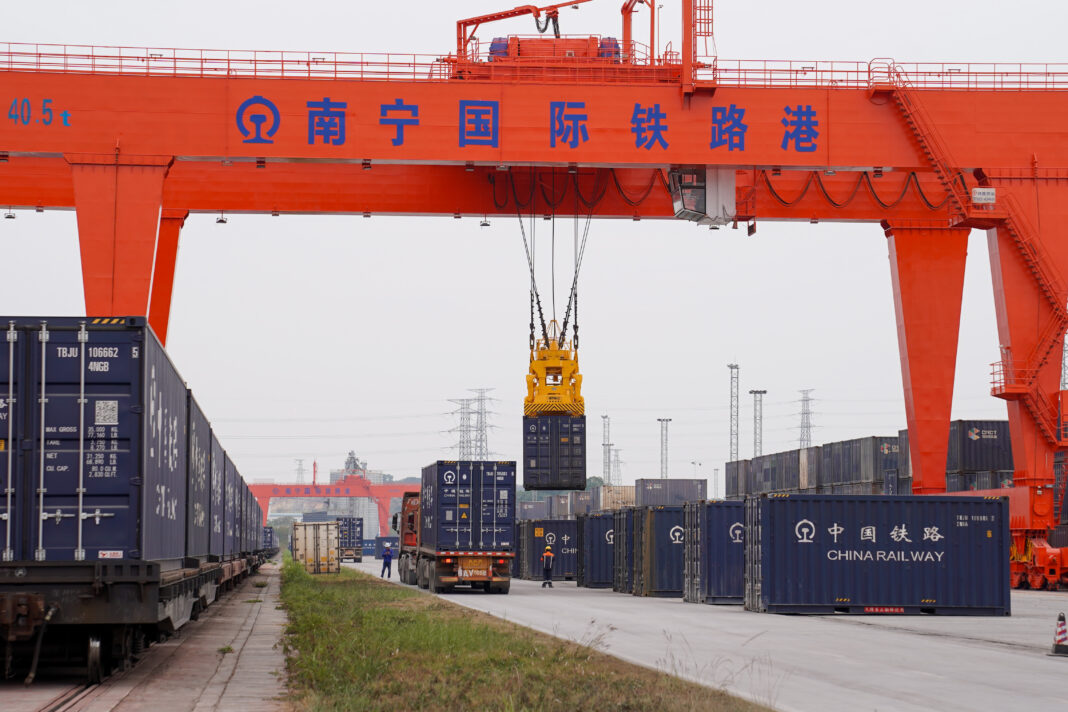 在广西南宁国际铁路港作业区内,一个个集装箱被吊装上火车,装车完毕的中越班列准备发往越南。