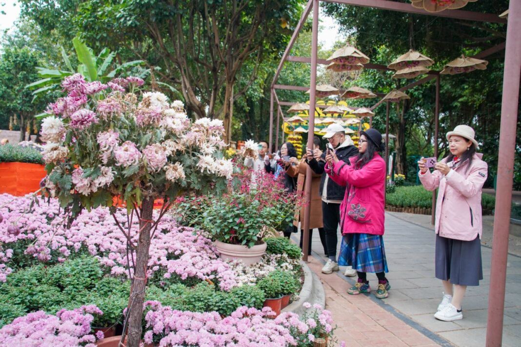 南宁青秀山风景区以南亚热带植物景观为特色,群峰起伏、林木青翠,被誉为南宁的“城市绿肺”。近年来,该景区积极打造“季季花节、月月赏花”品牌,以“赏花经济”赋能生态旅游发展。第九届青秀山菊花展正在该景区东盟友谊园举行,10万余盆鲜花美丽绽放,吸引采访团成员驻足欣赏和拍照留念。