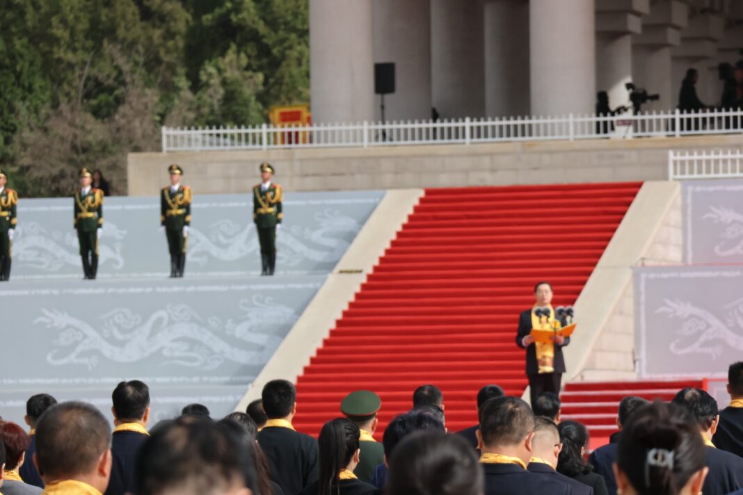 春和日暖,古柏凝翠。典前序礼上,序礼执事宣诵《典前祝文》,来自全国部分省、自治区、直辖市,香港、澳门特别行政区和台湾地区以及海外的参祭嘉宾,在仪仗队的引领下,至诚至虔,一路景行轩辕桥、龙尾道,至轩辕庙山门。轩辕广场上,象征中华民族大团结的56面龙旗迎风飘扬,参加公祭大典的各方代表在指定区域列队肃立,现场气氛庄严、肃穆。
