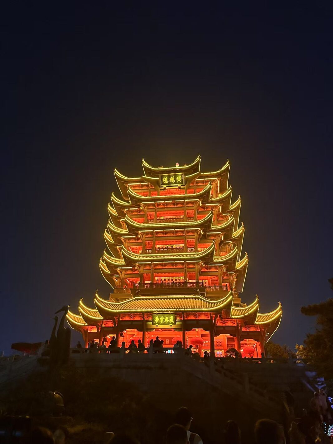 黄鹤楼,江南三大名楼之首,始建于公元 223 年的东吴军事要塞时期。从最初的军事瞭望台,历经唐宋明清各朝更迭,其建筑形制不断演变,逐步升华成中华文化的诗意象征。如今的黄鹤楼以清代 “同治楼” 为蓝本重建,高 51.4 米,72 根立柱稳稳撑起层层飞檐,金色琉璃瓦在灯光映照下,仿若黄鹤振翅欲飞,完美呼应古老传说。