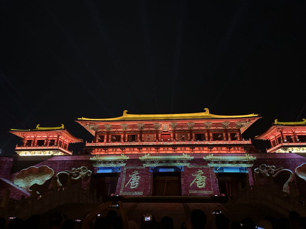 随着夜幕降临,采访团来到了充满梦幻色彩的唐城景区。一踏入景区,便仿佛置身于千年前繁华昌盛的大唐盛世。灯火辉煌的朱雀门巍峨耸立,仿古建筑在灯光的映照下美轮美奂,飞檐斗拱、雕梁画栋,每一处细节都完美还原了大唐建筑的雄浑大气与精致典雅。街头巷尾,身着唐装的演员与游客穿梭其中,各种精彩的民俗表演接连上演。