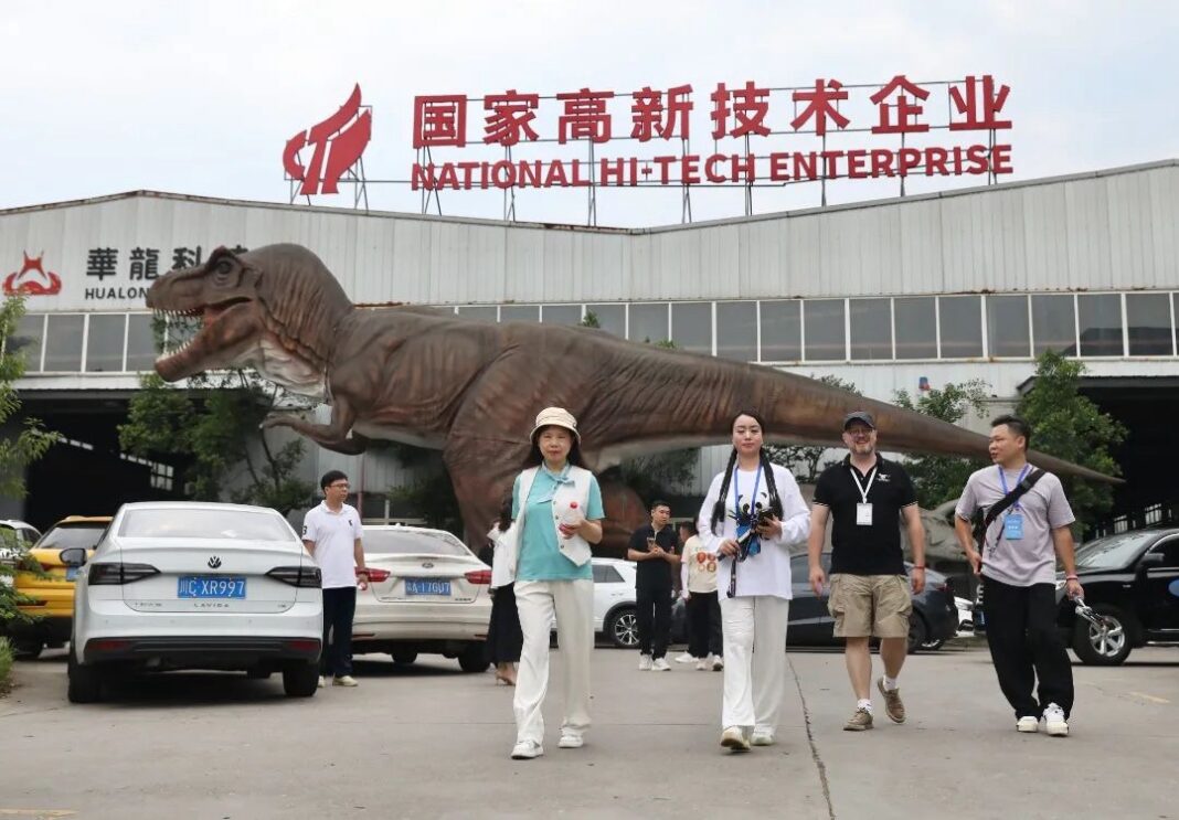 世界灯会看中国、中国灯会看自贡”,自贡作为“恐龙之乡”“中国灯城”享誉海外。记者朋友们在自贡高新区华龙科技有限公司详细了解了仿真恐龙、彩灯灯组等产业方面的发展和成就,近距离感受了“侏罗纪世界”中的震撼。该公司制作的40米仿真霸王龙曾获得“世界上最大的活体仿真霸王龙”吉尼斯世界纪录。