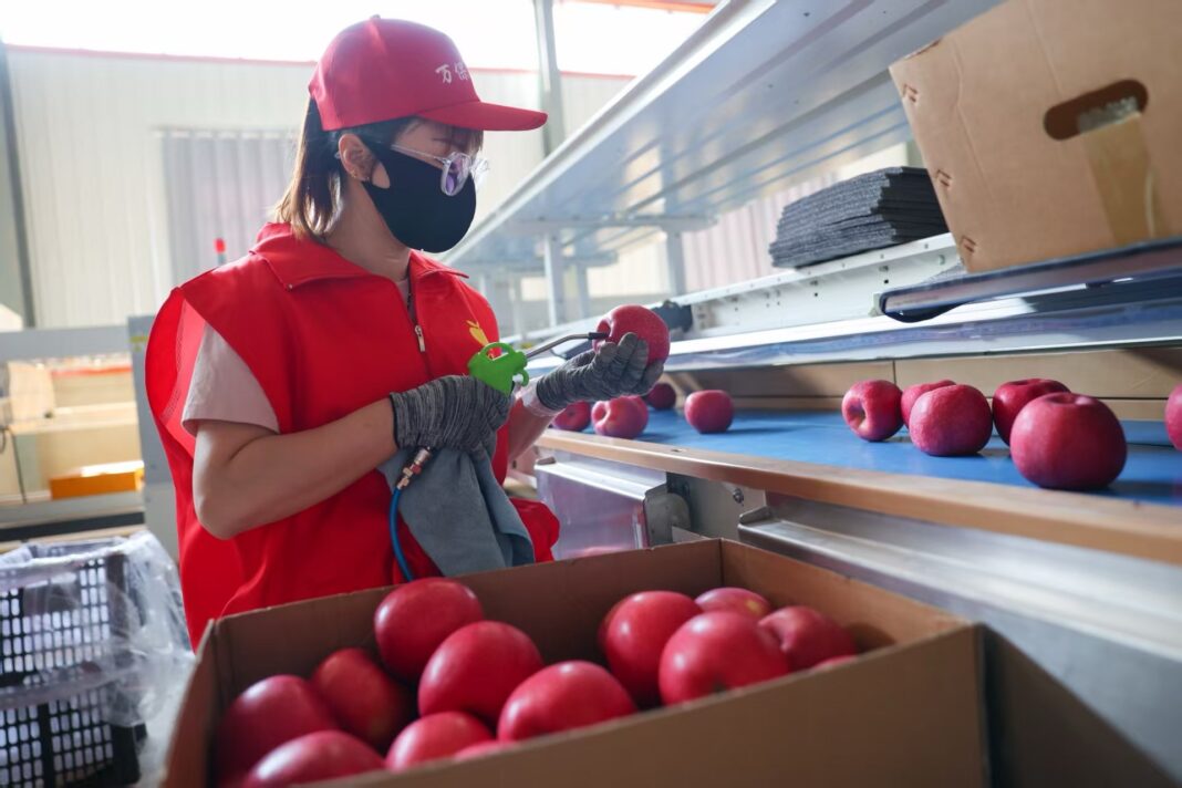 走进运城市万华果品股份有限公司,从冷库中取出的苹果被放在果品分拣设备上,经过一系列仪器设备,对苹果的重量、颜色、糖度、残次等进行量化分析、精准分级,层层筛选后分往不同轨道,一颗颗红彤彤的苹果通过人工的再次查验后才被装箱。