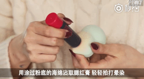 用涂好腮红膏的美妆蛋晕染在脸颊上。