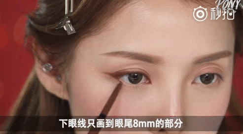 外眼线画的时候要注意眼尾,上扬拉长,填补成一个三角,这样有开外眼角的感觉。