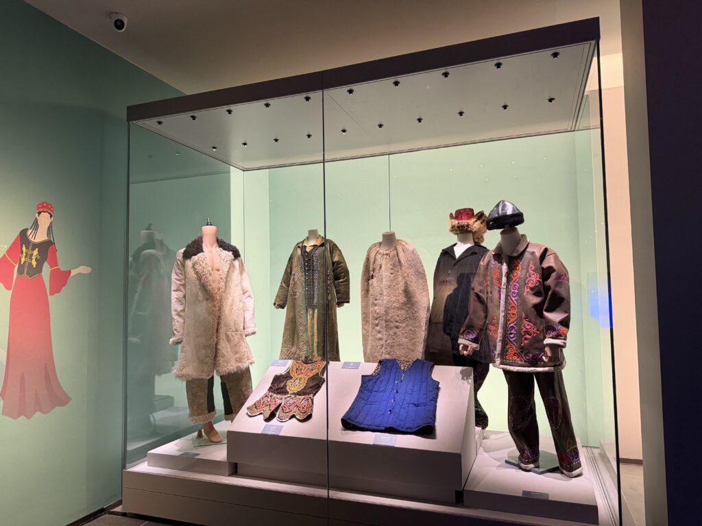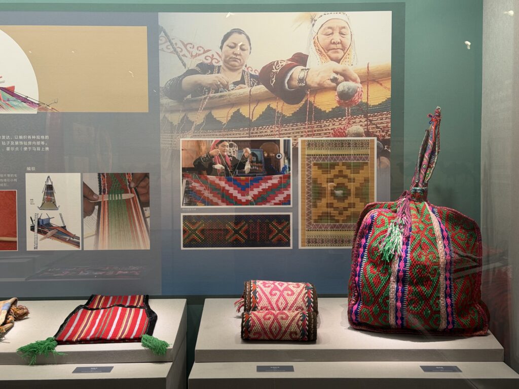 非遗瑰宝在馆中绽放光彩。那张获基尼斯认证的巨型花毡堪称镇馆之宝,两名传承人耗时数月绣制的作品上,五十六只和平鸽与雪莲花环绕传统纹样,用红蓝绿等象征天地生命的色彩,诉说着民族团结的深意。配合“丝线传情 锦绣千年”特展展出的110余件刺绣珍品,从传统服饰到现代摆件,展现着这项非遗技艺的活态传承。此外,雕花银马鞍的纹路、冬不拉的蟒皮琴箱,无不镌刻着游牧民族的审美与智慧。