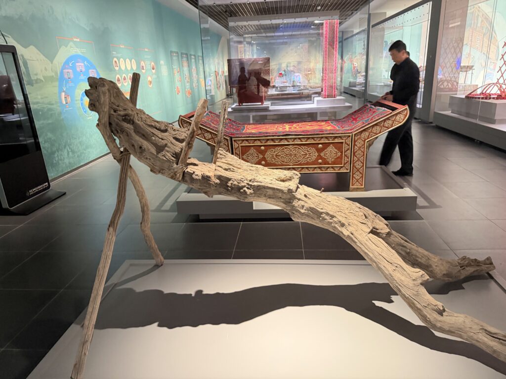 历史展厅是时光的长廊,三趾马下颚骨化石无言诉说着这片土地的远古记忆,而刻着狩猎痕迹的盘羊头骨,则见证了先民与自然的早期博弈。三个展陈单元层层递进,从哈萨克族的迁徙史诗到传统经济模式,从日常起居到节庆礼仪,全方位铺展民族发展长卷。复原毡房内,羊毛花毡的星月纹路暗合草原历法,包浆温润的马奶酒囊仿佛仍飘着发酵芬芳,缀满彩珠的“吐马克”帽上,每道刺绣都是部族图腾的基因图谱。