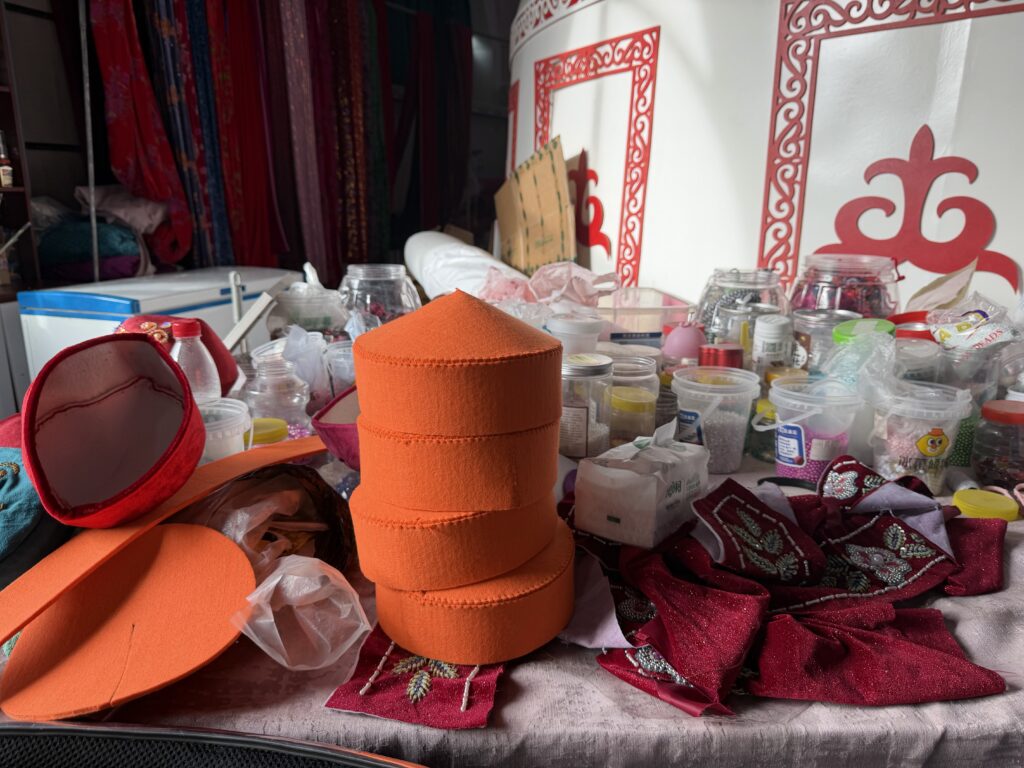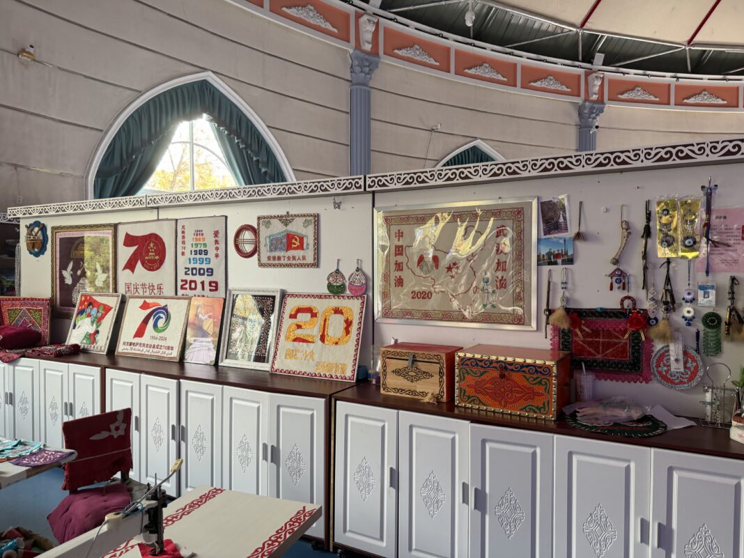 指尖技艺是体验中心的核心风景。国家级非遗哈萨克族刺绣展台前,“陇原巧手”巴迪哈带领社员们飞针走线,羊角纹、鹰纹等源自自然的纹样在布帛上舒展,每平方厘米26针的细密走线,藏着草原美学的密码。这些刺绣作品不仅是装饰,更承载着母辈对女儿的祝福——许多床帷、挂毯都是母亲为女儿准备的嫁妆。不远处,毡房制作传承人哈哈尔曼正讲解桦木顶圈的搭建技巧,网状木杆与芨芨草帘的组合,再现了游牧民族“逐水草而居”的生活智慧,他带出的近10名徒弟,正让这项省级非遗技艺延续活力。金属加工台前,匠人錾刻的银器纹路清晰,皮革工艺展区的皮具光泽温润,每样作品都镌刻着时光的痕迹。