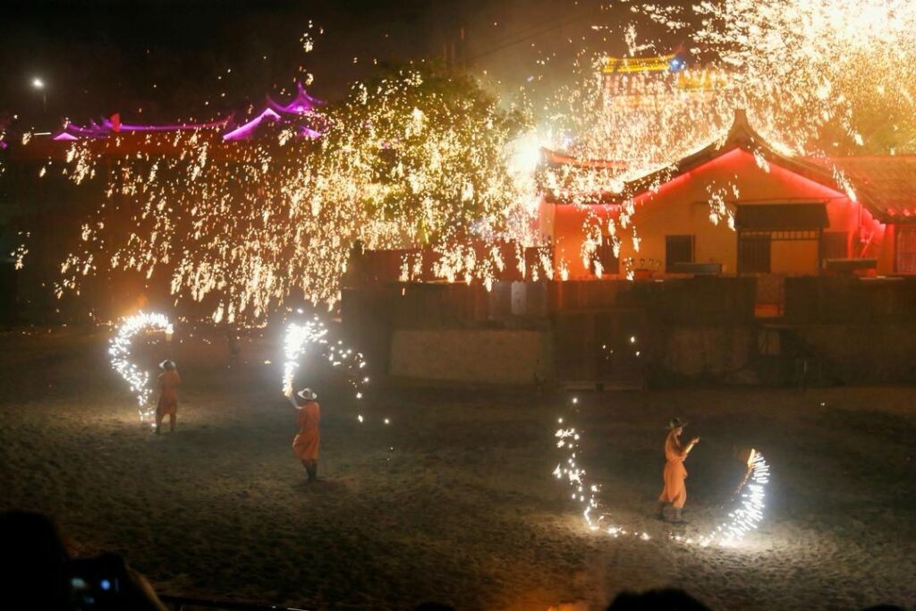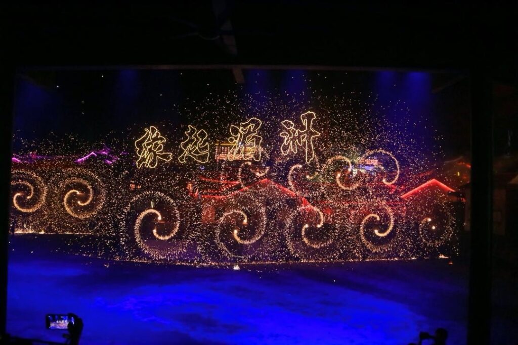 随后,华媒代表们转场至《缘起湄洲》专属演出场馆,开启文化与历史的沉浸式体验。场馆中央熔炉率先燃起烈焰,非遗“打铁花”表演正式登场。非遗传承人手持工具,将千余摄氏度的铁水奋力击向夜空,高温铁水瞬间炸裂,化作漫天金红交织的火花,如星河倾泻、似烟花绽放,在夜色中勾勒出震撼人心的光影画卷。