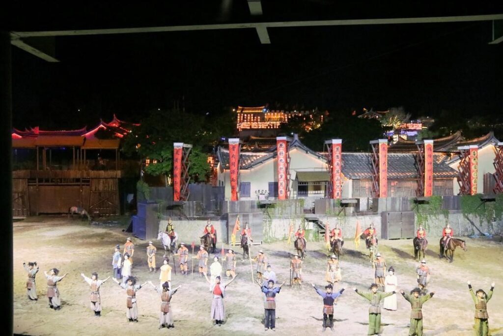 场景剧《荡寇风云》以明代湄洲岛军民抗击倭寇的历史为背景,通过实景搭建的古战场、演员们饱含张力的演绎,配合灯光与音效的沉浸式渲染,生动还原了当年军民并肩御敌、浴血奋战的岁月——倭寇袭岛时的浓烟、渔民与士兵的呐喊、将领挥剑冲锋的坚毅身影,将现场观众瞬间带回数百年前的烽火时光。