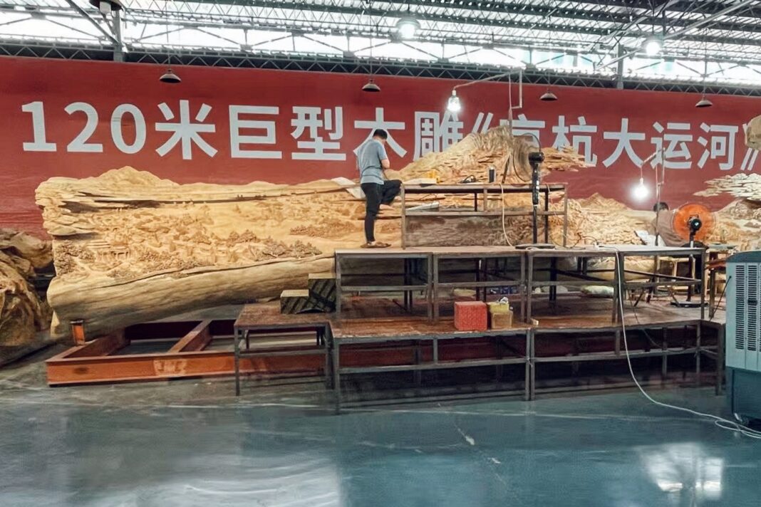 据现场负责人介绍,这件作品选用优质硬木,集结“仙作”木雕技艺骨干力量,耗时已超两年,旨在以立体木雕形式呈现京杭大运河的历史变迁与文化价值。走近细看,匠人指尖下的船帆纹路清晰可辨,市井人物的衣袂褶皱富有动感,运河两岸的树木枝叶层次分明,传统榫卯与浮雕、透雕技法的融合,让静态木雕仿佛涌动着运河的千年水运活力,令人直观感受到“仙作”工艺的精湛与中华大地的人文脉动。