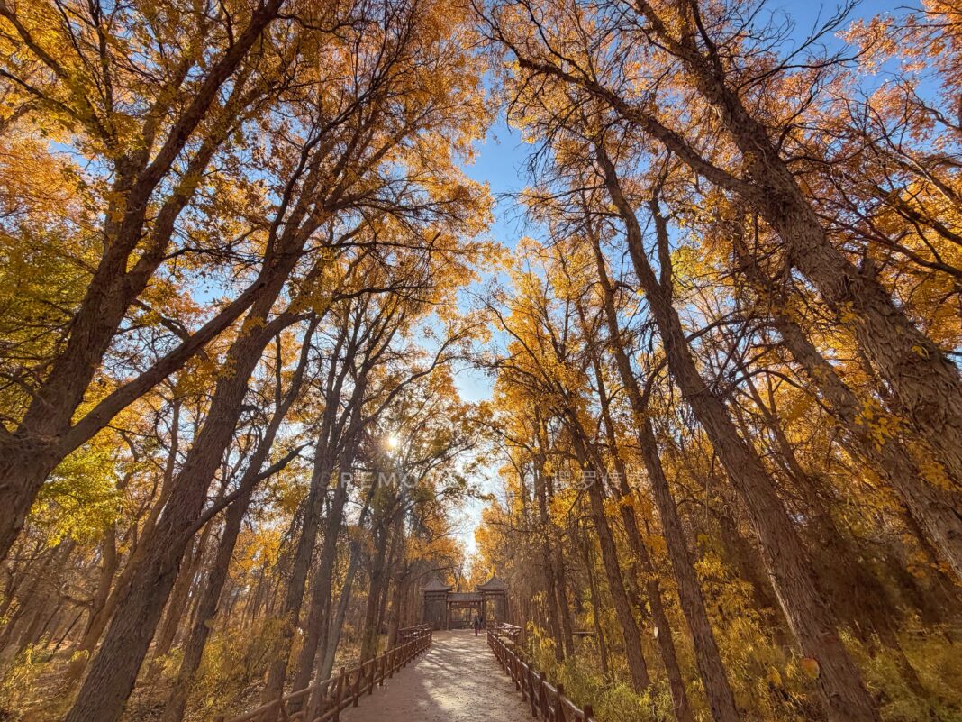 每年9月底至10月中旬,是这片胡杨林最美的时节。当秋风掠过沙丘,万亩胡杨仿佛被上帝打翻了调色盘,从墨绿渐变为金黄,最后定格成耀眼的金红。阳光穿过枝叶,在林间洒下斑驳的光影,脚下的栈道被落叶铺成柔软的“金毯”,每一步都像踩在流动的光芒里。