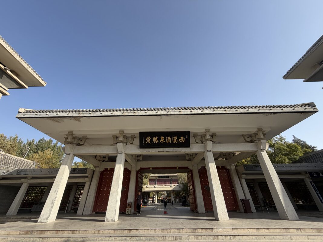 除了丰富的历史遗迹,园内的自然风光同样引人入胜。百年古柳环绕泉池生长,秋冬时节叶片已染成金黄,微风拂过,金黄的柳叶便悠悠飘落,有的落在泉面随波轻晃,有的铺在青石板路上,踩上去软软的。若遇初雪,枝头便会积上一层薄雪,银装素裹间,更显园林的静谧雅致。漫步在园内的青石板路上,能听到泉水潺潺的声响,闻到草木入秋后特有的清冽气息,仿佛暂时脱离了城市的喧嚣,得以与两千年前的丝路风华隔空对话。