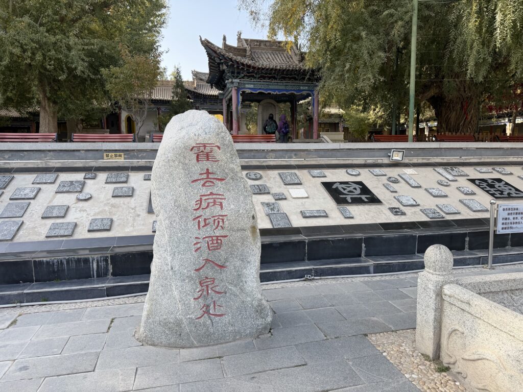 步入胜迹,核心景观 “古酒泉”最是引人入胜 。这处天然泉眼自汉代起便持续喷涌,水质清冽,常年不涸。即便是秋冬时节,泉面也从不结冰,唯有清晨时会浮着一层薄薄的水汽,朦胧中更显古朴。泉边立着一座古朴的 “西汉酒泉胜迹” 碑,碑体虽因年代久远略显斑驳,边角处还沾着些许秋霜的痕迹,但风骨依旧,仿佛仍在诉说当年的豪情往事。据记载,公元前 121 年,霍去病率军大败匈奴,汉武帝特意赐御酒嘉奖。当时将士众多,酒液不足以人人分到,霍去病便将整坛御酒倒入泉中,让全军共同饮用,“酒泉” 之名自此流传下来,这片土地也因此留下了 “汉武雄风” 的精神印记。