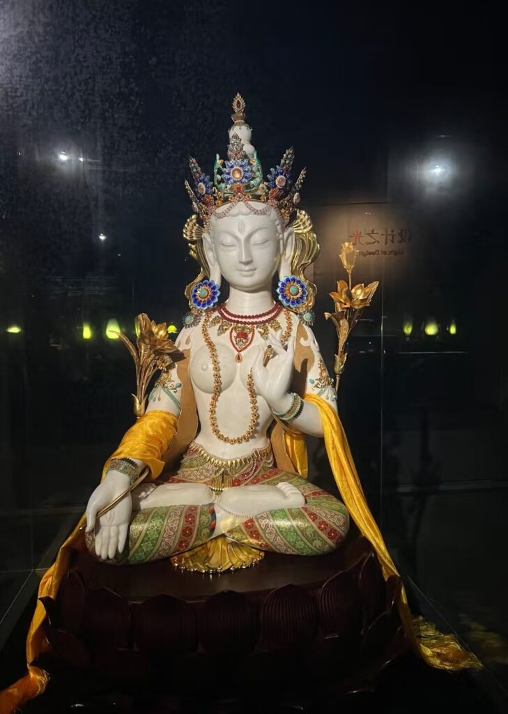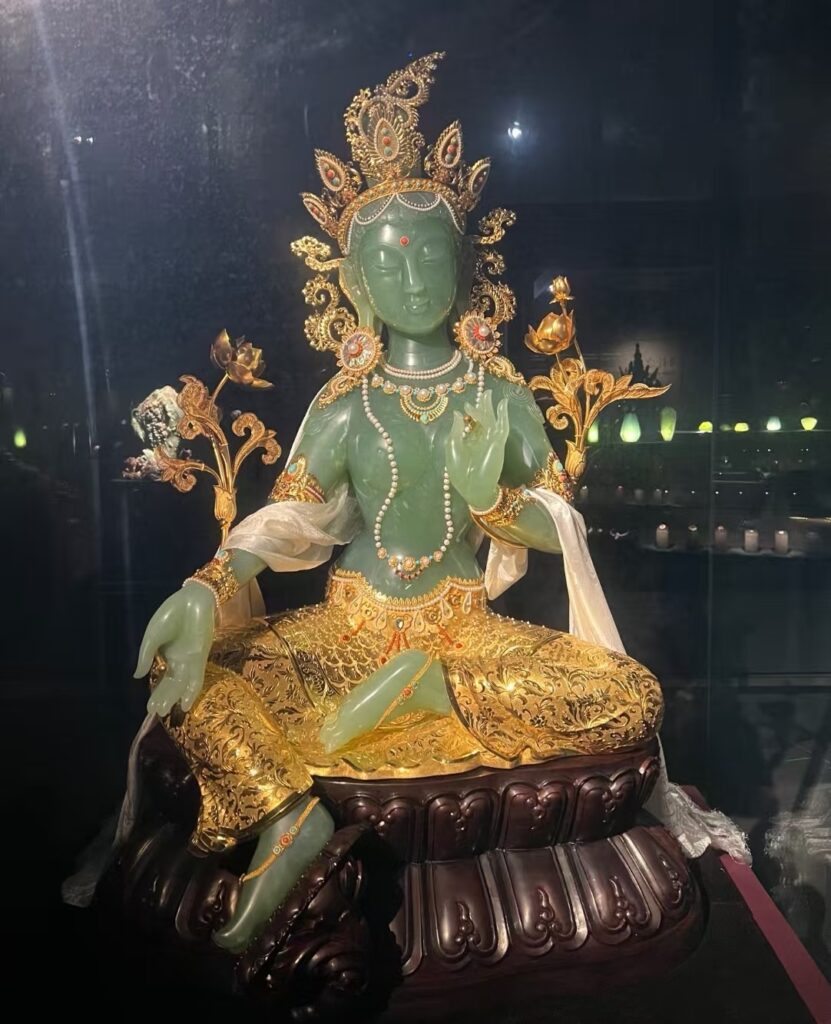 缪国济所说的两尊“玉佛”,是中国工艺美术大师张明娟历时十余年设计创作的金玉白度母和金玉绿度母,是她艺术生涯耄耋之年的巅峰之作。度母以玉雕为主体,天冠、璎珞以纯手工花丝、錾刻烧蓝、螺钿等工艺制作而成,镶嵌多种宝石。