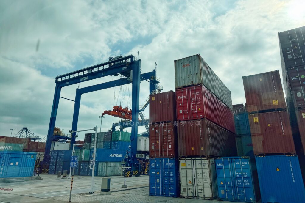 在洋浦国际集装箱码头,近日刚刚投用的扩建工程岸桥伸缩,吊装即将运往海外的集装箱货柜。