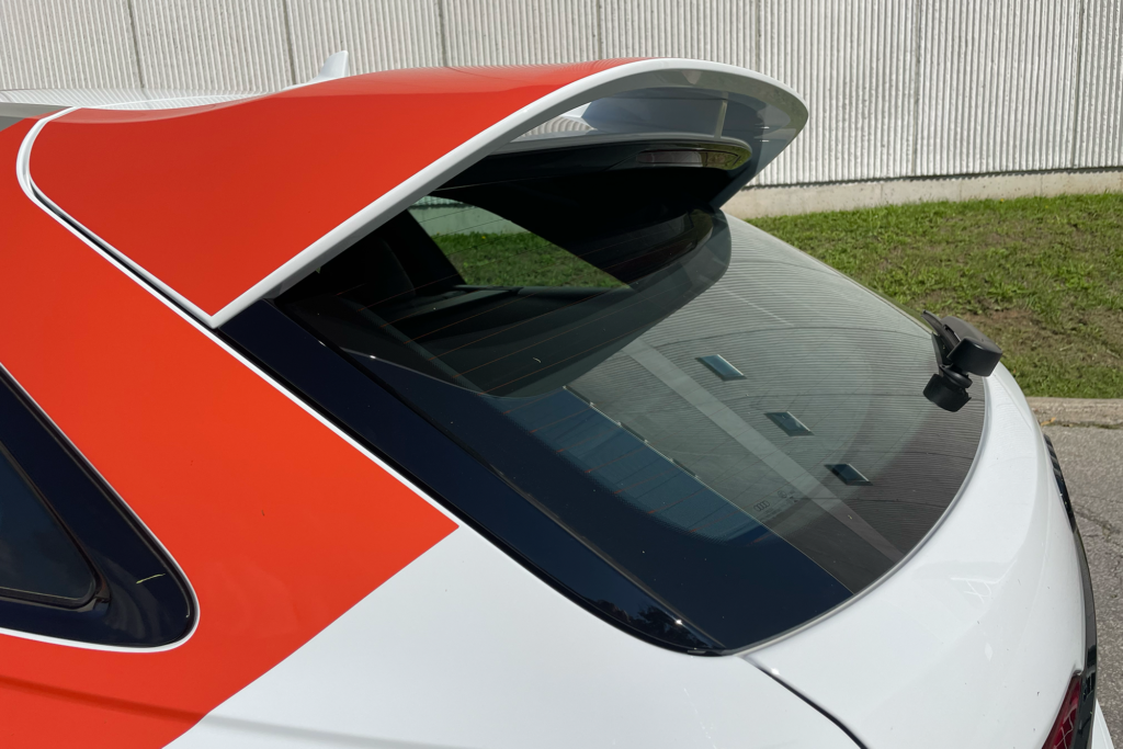 细心观察便会发现,碳纤维材质的应用无处不在——轻量化引擎盖、隆起的翼子板,恰到好处地包裹着22英寸白色合金轮毂。必须单独为这套轮毂点赞,纯净的白色与性能感碰撞出独特的时尚张力,也让我们忍不住向车企呼吁:多来点白色轮毂选项吧!