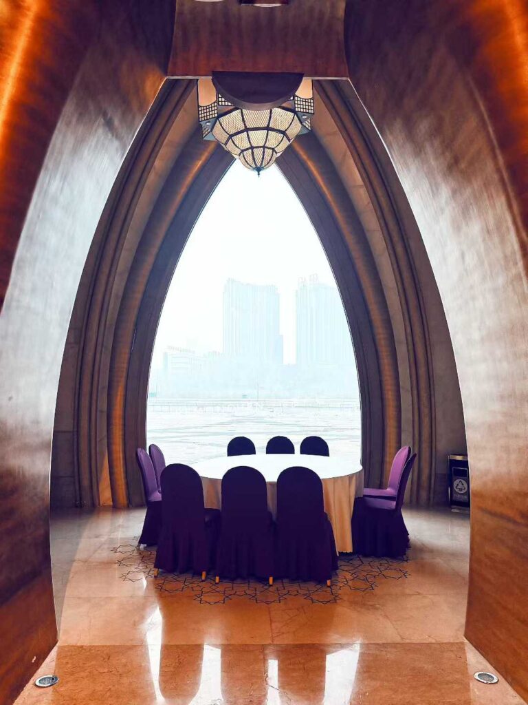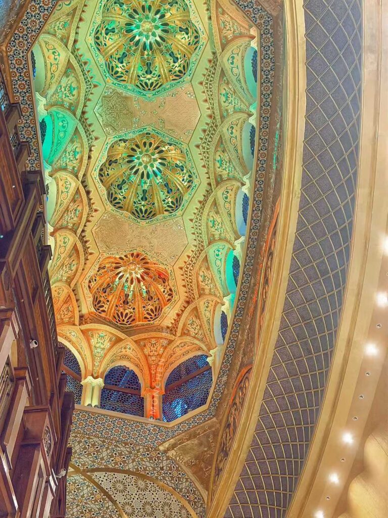 作为中国国内最高的穹顶类剧院,新疆大剧院是“十二五”期间文化旅游产业重点项目,总投资17.6亿元,总建筑面积达10.2万平方米,建筑高度80米,由全国建筑设计大师孟建民主持设计,2014年建成投用并于2020年斩获中国土木工程詹天佑奖。其独特的“天圆地方”中心对称结构,融合伊斯兰建筑的拱券、长廊、水池等元素,通过内外两层嵌套的空间钢桁架体系,实现了花瓣与蕊芯层套的艺术造型——南北两侧外壳26榀主桁架最高达71.4米,中间内壳10榀主桁架跨度90米,创下国内外同类结构工程之最。剧院内部更藏巧思:38米高的穹顶中央大厅由三组层叠穹窿组成,暗合维吾尔族“九天”之意,顶面数十位画师耗时三个月纯手工绘制的伊斯兰纹样,融入敦煌壁画元素与雪莲花、石榴花等地域符号,搭配木雕、铜艺、螺钿镶嵌等传统工艺,尽显金碧辉煌的西域风情。4000平方米的国内最大室内表演舞台上,36处立体实景与2800余台电脑灯、声光电、水幕、烟火等顶级机械装置联动,66米舞台深度、86米超广表演视线区,实现了全球首创的多维度场景转换,效果可媲美拉斯维加斯欧秀。