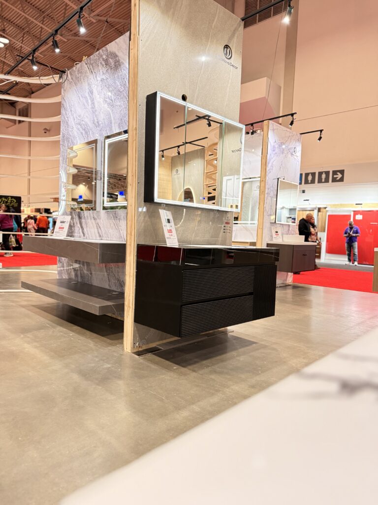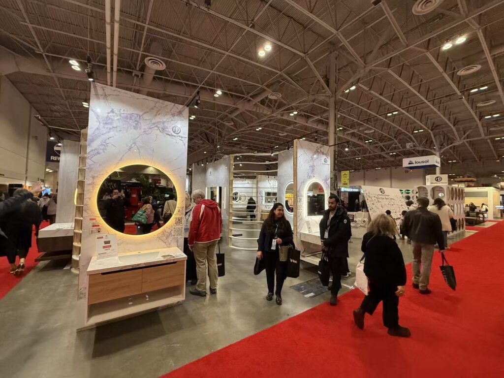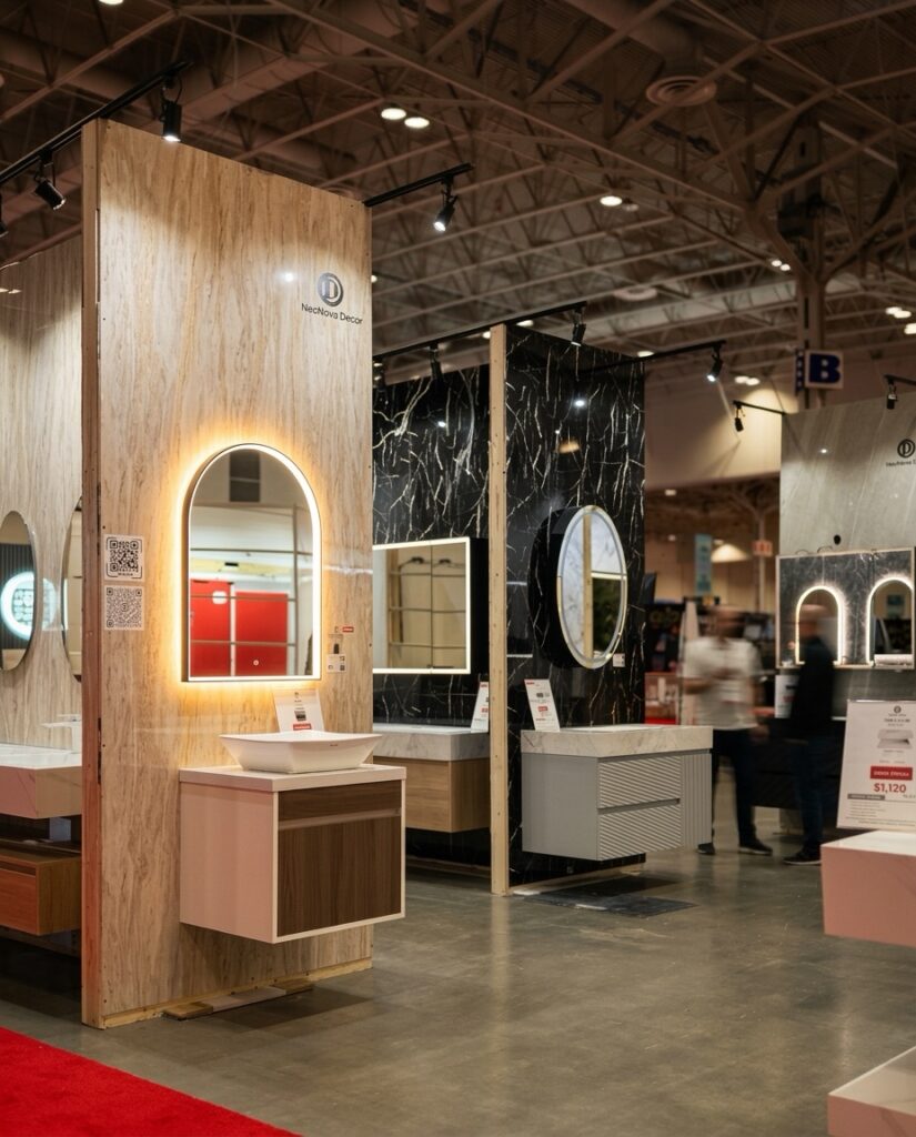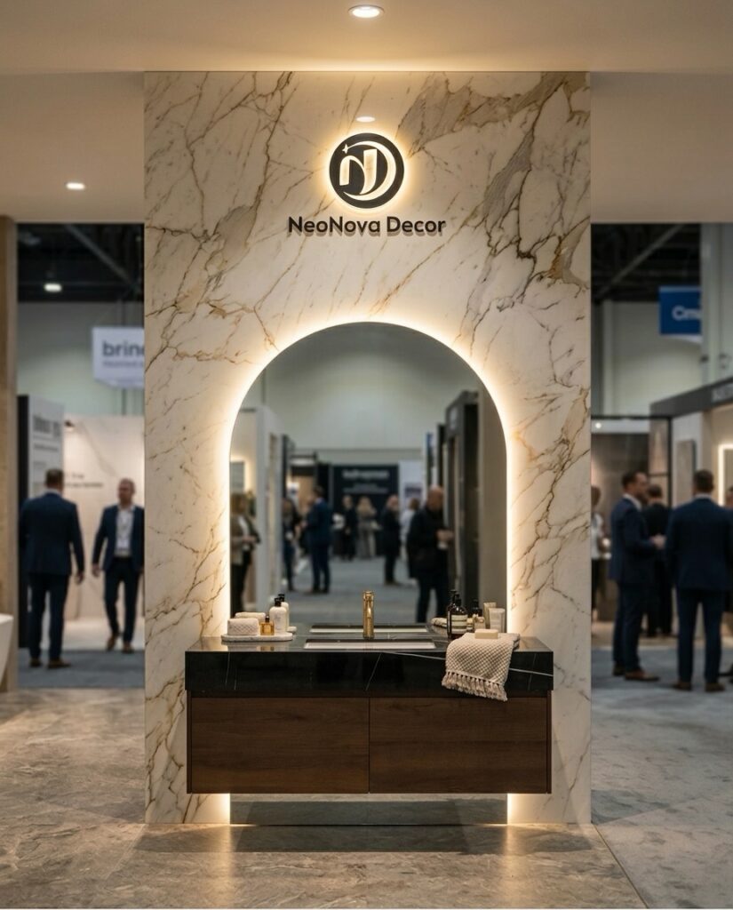 在刚刚结束的2026 National Home Show上,NeoNova Decor的表现引起关注。其展位位于入口区域,通过统一的设计语言与大体量空间,形成了较强的视觉识别。整体以极简风格展开,结合岩板材质、悬浮浴室柜以及LED镜子与镜柜产品,构建出完整的浴室空间场景。