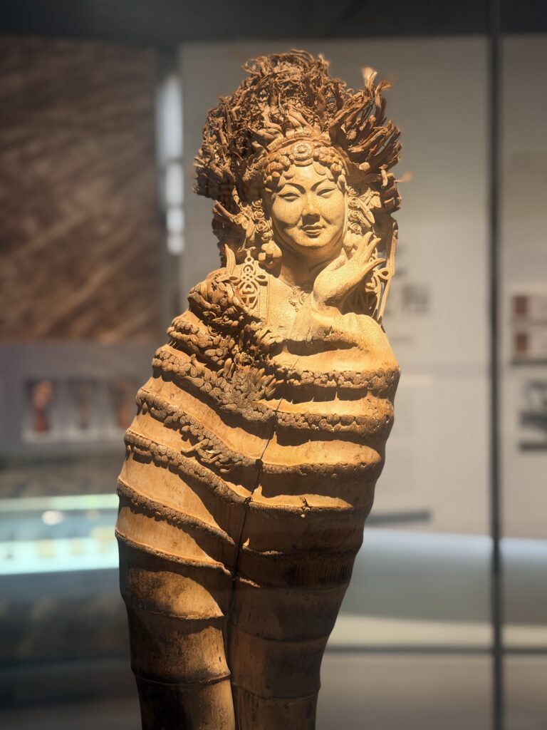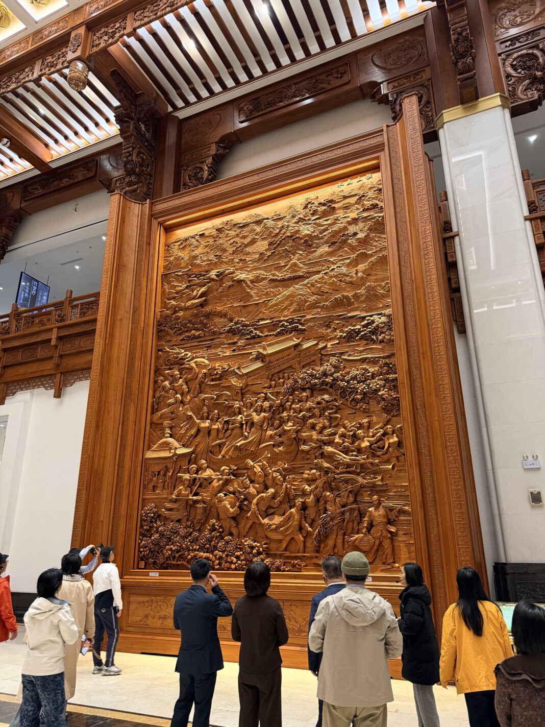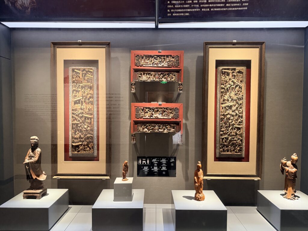 坐落于东阳城南东路的中国木雕博物馆,是“世界木雕之都”东阳的文化地标,近2.6万平方米的建筑里,藏尽千年木雕风华。由上海世博会艺术顾问徐征野设计的馆体,将“天圆地方”的传统哲学与东阳木雕元素相融,未入馆便见匠心。步入馆内,16米通高的挑空大厅搭配气势恢宏的木雕走廊,瞬间让人沉浸在木质艺术的厚重氛围中。六大展厅各有乾坤,从木雕历史到社会生活,从大师佳作到世界木雕,再到竹艺专题,每一个空间都在诉说着木头在匠人手中被赋予新生的故事,让海外华媒代表们循着展陈,走进木雕艺术的时光长河。