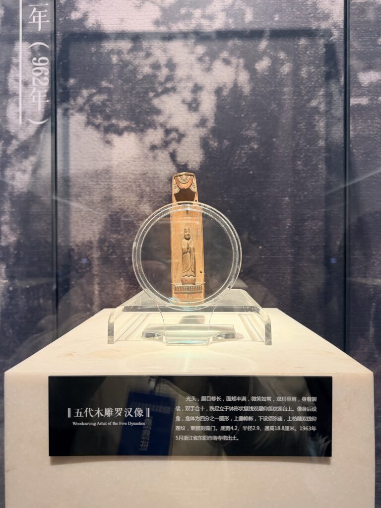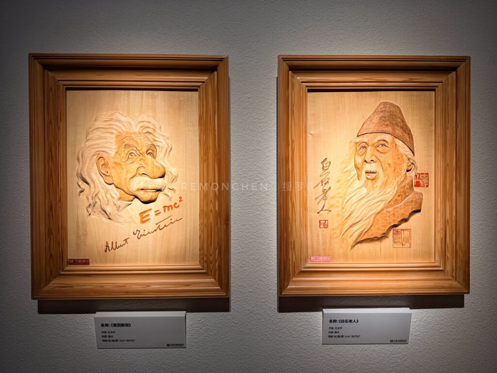 馆内的镇馆之宝——五代木雕阿难罗汉像,成为代表们驻足品读的焦点。这尊出土于东阳南寺塔、距今超千年的枫木雕像,虽形体小巧,却融汇阴刻、阳雕、浮雕、圆雕等多种技法,双手合十的姿态笑意亲和,刀法洗练传神,尽显北宋初年东阳木雕的超高艺术水准,也让海外华媒直观感受到中华传统工艺的千年底蕴。作为东阳木雕的特色,以平面浮雕为主的技法、保留原木纹理的“白木雕”风格,让木雕作品兼具自然之美与工艺之精,展陈中既有传统建筑装饰、佛像雕刻的经典之作,也有木雕融入现代生活的创新设计,让代表们看到传统技艺与当代生活的完美相融。