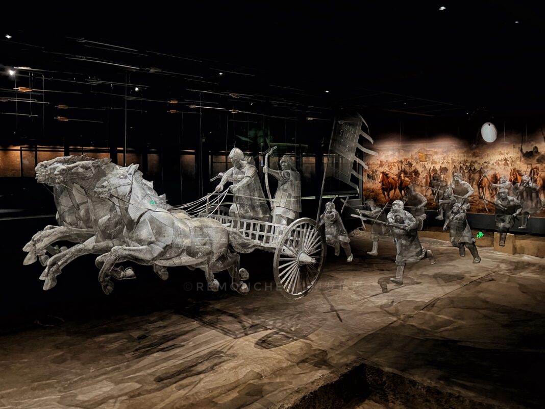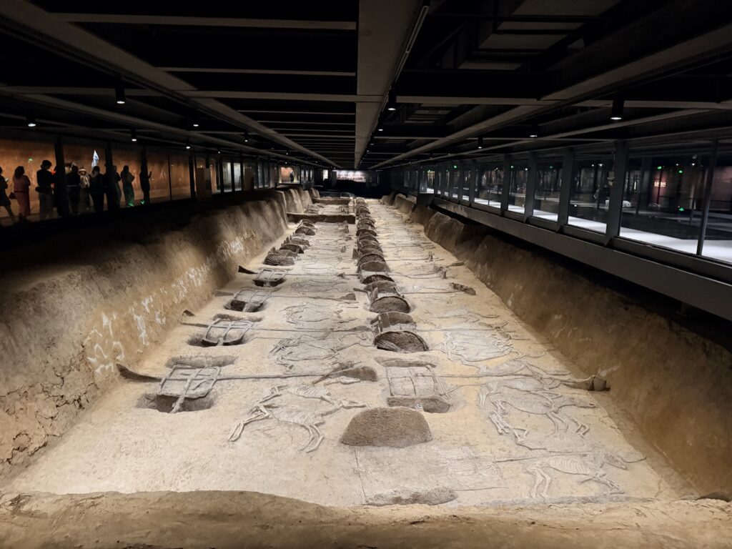 8200平方米的车马阵展厅,是景区最震撼的核心。40座车马坑整齐排布,其中1号大车马坑长132.6米、宽约12米,为国内已发掘最长单体车马坑,已出土43乘车、165匹马,含两马驾、四马驾、六马驾车型,完整再现楚国“千乘之国”的军威。展厅以遗址本体为基础,融合VR、互动屏、艺术雕塑等手段,打造沉浸式体验,游客漫步其中,仿佛穿越千年,直面楚王出行的浩荡阵容。