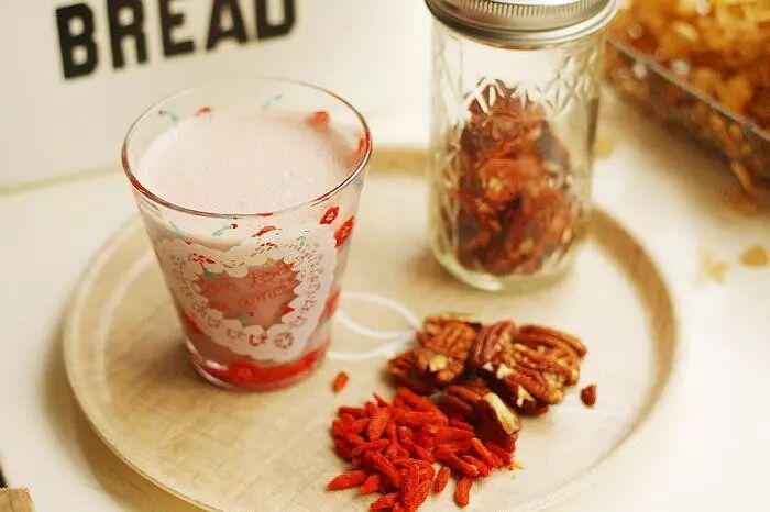 ❶ 枸杞要提前用水泡一下。水果洗干净。所有材料放入搅拌杯内。