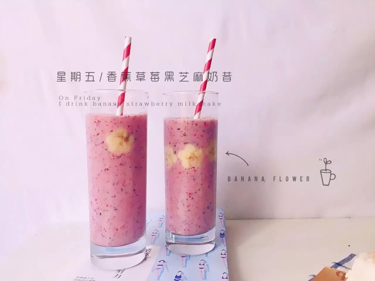 ❸ 将香蕉切段,草莓切块,跟黑芝麻牛奶一起倒入搅拌器,搅拌均匀即可。